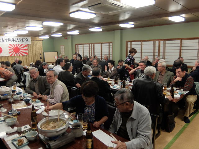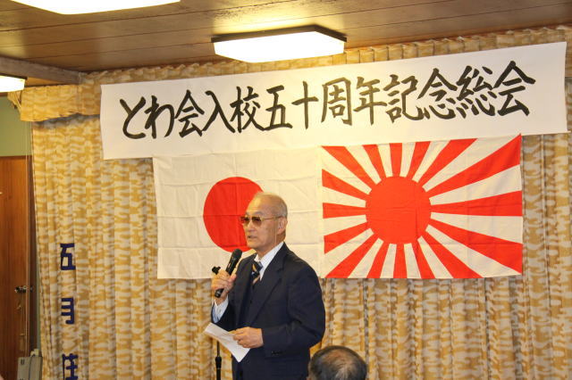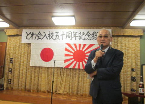 さて、始めにこの卒業50周年記念クラス会を催すに際して、計画調整実施に多大の尽力を頂いた山田実行委員長、山崎幹事長始め、とわ会役員各位に深甚なる敬意、感謝の意を評したいと思います。特に山田道雄君には多忙な中、無理を承知で実行委員長についてもらい、約2年に亘り何回となく東京、呉、江田島間を往復して頂くなど、細部調整に奔走、御労苦をお掛け致しました。拍手でその労を労いたいと思います。