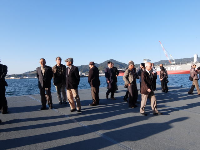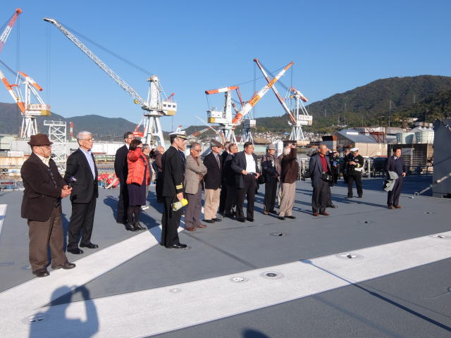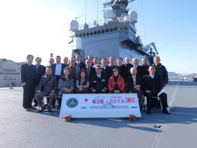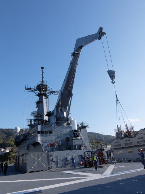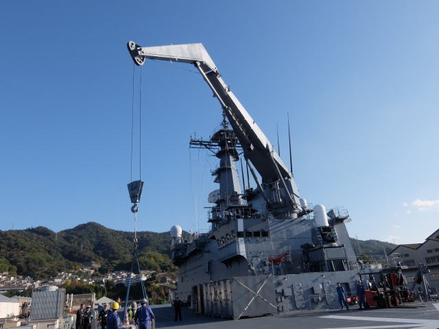輸送艦「「おおすみ」の見学は、艦長の案内により行われました。 就役してまもなく20年を迎える艦ですが、その大きさに驚いていたご婦人方もおられたようです。 甲板上では大きなクレーンの模範展示も行われました。