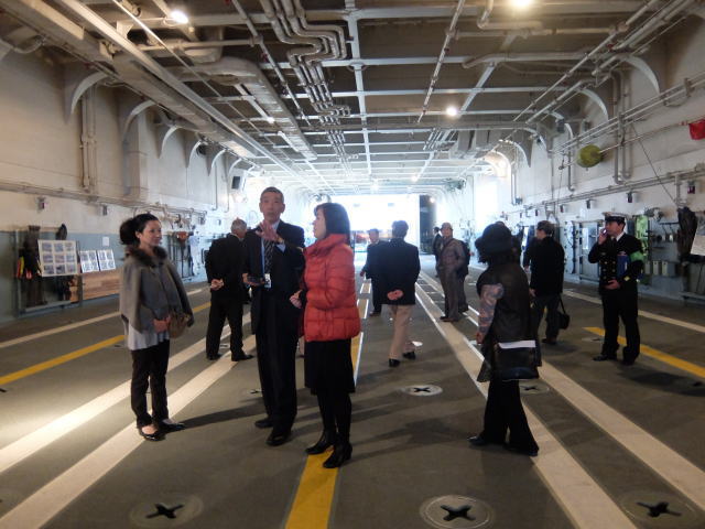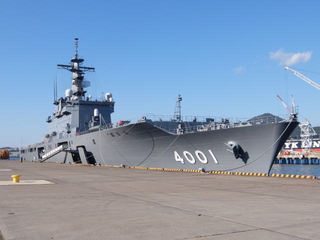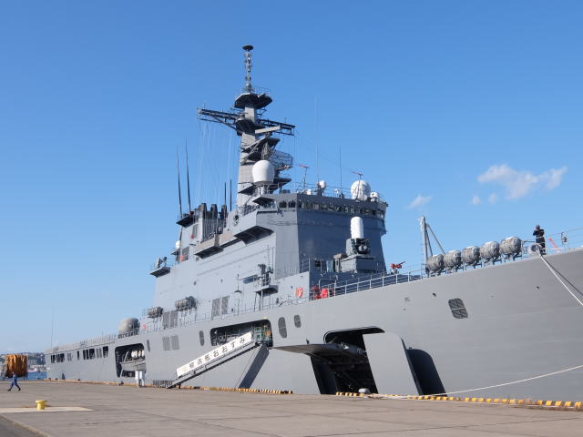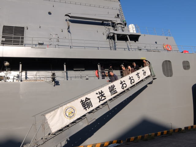 オプショナルツアーの艦艇見学は、1日目の14時30分から輸送艦「おおすみ」で行われました。 輸送艦「おおすみ」は平成10年(1998年)3月11日に就役しました。 基準排水量8900トン、全長178m、最大幅25.8mです。 最大速力は22ノットです。