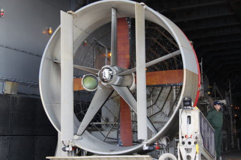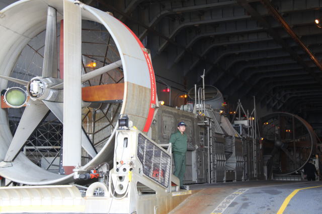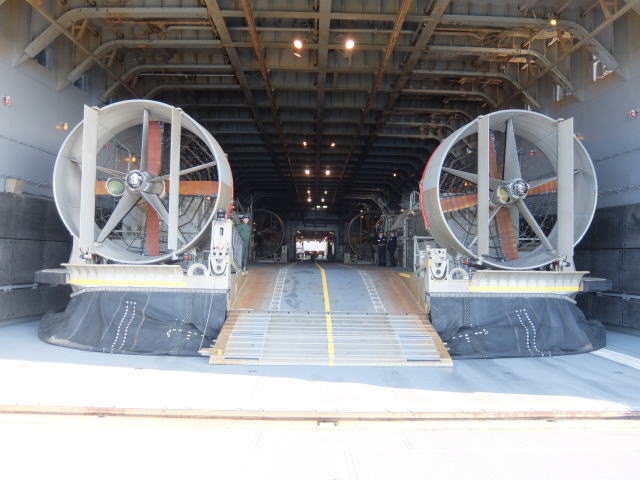輸送艦「おおすみ」で最後に見学したのが、LCACです。 輸送艦「おおすみ」には、輸送用エアクッション艇(LCAC)が2艇搭載されています。 LCACは、排水量85トン、全長26.7m、全幅14.3m、速力約40ノットです。 LCACは艇幅が広いため、「おおすみ」の船体ぎりぎりいっぱいで格納されています。