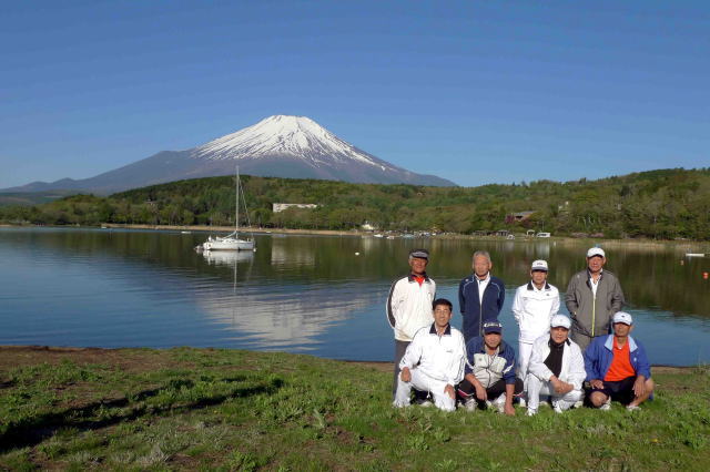 場所は、大学のテニス部が合宿に使う、謂わばテニス合宿専門の宿舎に陣取り、さすがテニス専門宿舎の、お年寄りには膝等、体に優しコートで快適なプレーを2日間に亘楽しみ、浩然の気を養うことが出来ました。 当日は天気も最高の皐月晴れで、天気があまりにも良く、富士山がとても綺麗でしたので、早朝テニスは山中湖畔の散歩に切り替え、湖面に映る逆さ富士をバックに記念写真を撮りました。