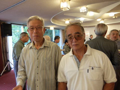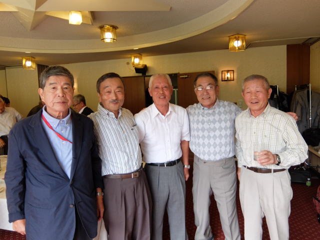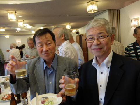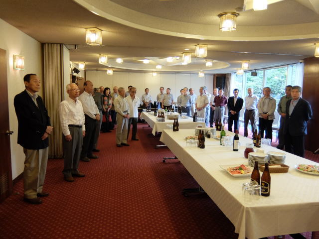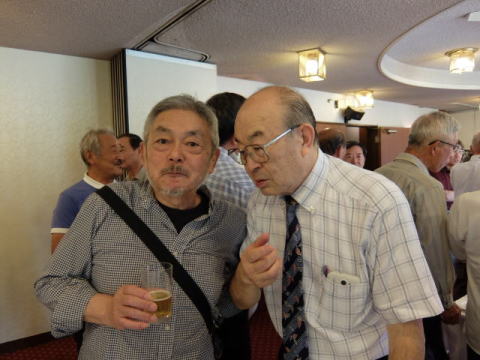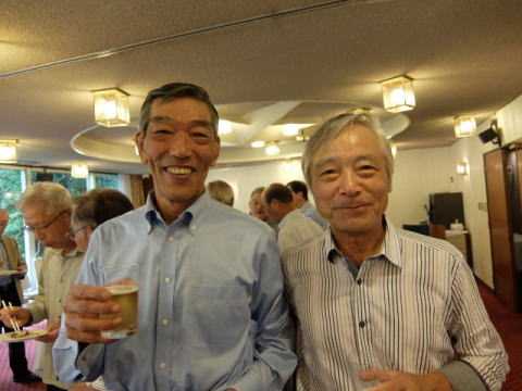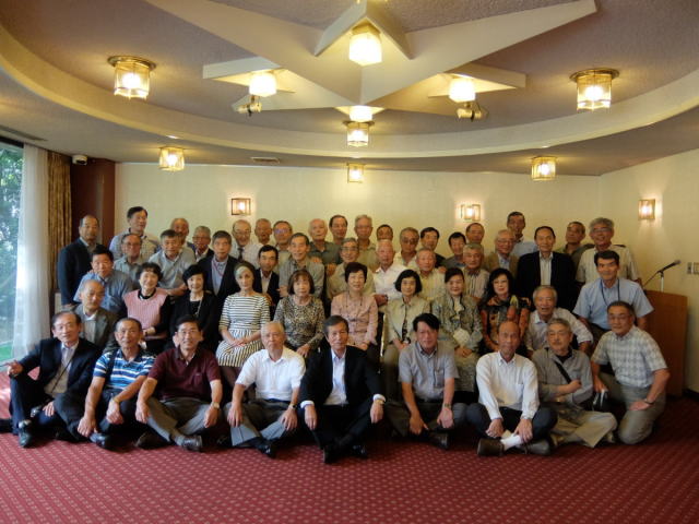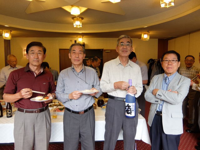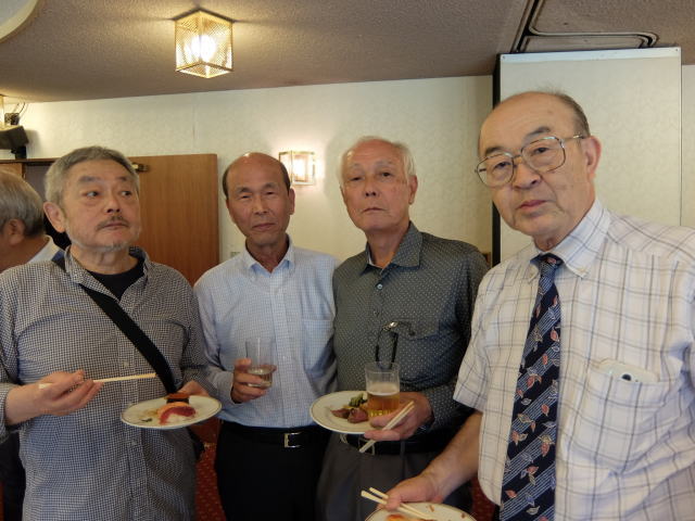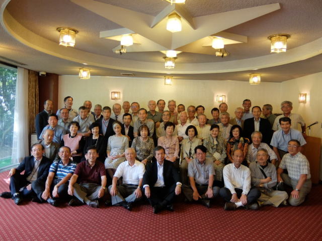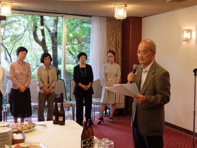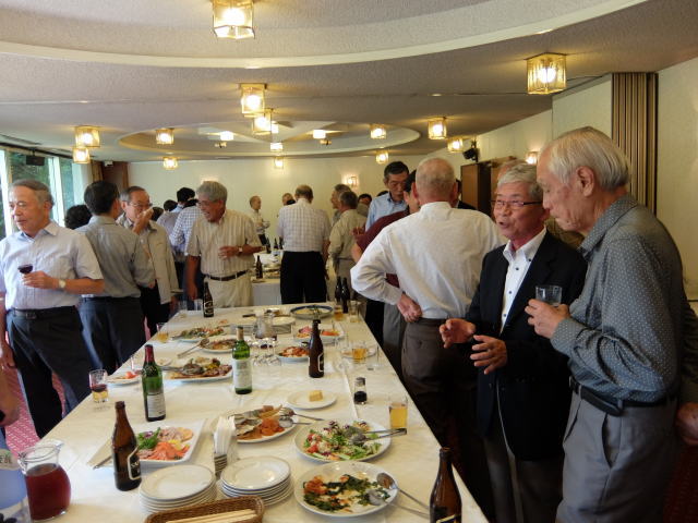続いて石川会長の挨拶がありました。 皆さん、今日は! 今年は会員42人、奥様方8人の計50人、昨年の49人よりも1人多い50人の参会が得られました。 遠くは大分から壱岐君、青森から角田君、神戸から八束君、また亡き富田君の奥様の御参会を得て盛大にクラス会を催し、クラスの再会が今年も叶えられたことを共に喜びたいと思います。 これも偏に忙しい現役の社長を務める傍ら、きめ細かくクラスの面倒を見ながら、労を惜しまずクラス会の開催に尽力して頂いた山崎幹事長あってのことと、山崎君に感謝の意を表したいと思います。