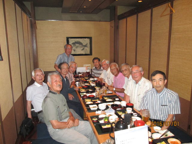 次の通り、定例会を実施しました。 1 期日・場所 平成28年7月1日(金)横浜市関内 2 参加者 11名 池田、岡本、河本、児玉、崎田、坂倉、竹村、中島、松井、渡部、山田 3 実施状況等 参加者11名は久し振りで、各人の近況報告では、話が全員に通じる限度の人数ではなかったかと思います。 参加者は皆元気で、活気に溢れ、我がクラスのパワーは当分大丈夫との印象を強くしています。昨年から昼間の実施にしていますが、夕方には帰宅でき、時間に余裕ができた感じです。 中島