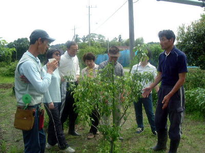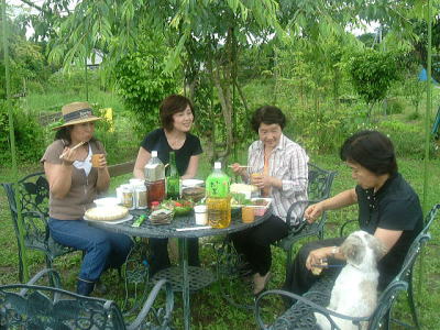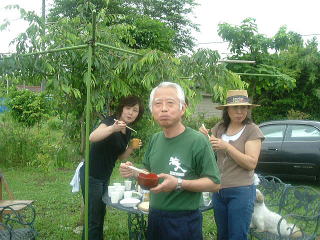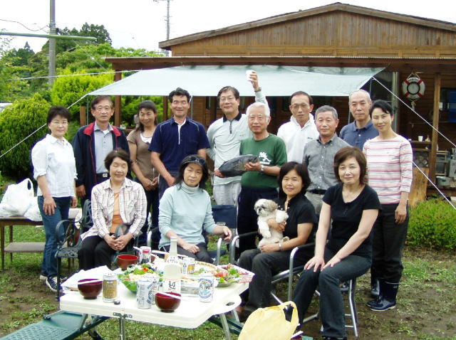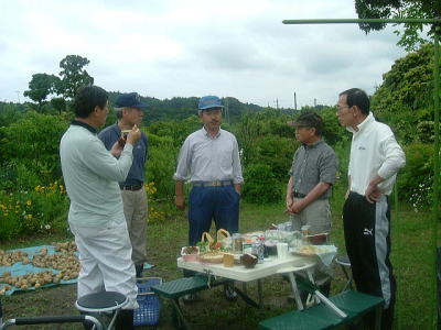 6月11日は台風4号の影響もあり、あやしげな雲が空を覆っていましたが、幸い雨は落ちてきませんでした。 10時半頃から三々五々、参加者が長谷農園に集まりました。 長谷農園主夫妻を始めとして、河本、熊野、竹村夫妻、水谷夫妻、山下(正)夫妻の同期のほか、後輩から石橋夫妻、木村夫妻、酒井夫人が参加し、総勢15名のイベントとなりました。