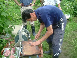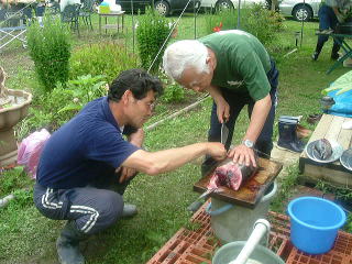 一連の作業が終わった段階で、次のイベントである懇親会に移りました。 懇親会の最初の段階で、メジ(本マグロの子)のおろしに河本君が挑戦。 農園主の指導の元、悪戦苦闘しつつ無事調理を完了しました。 新鮮で美味しかったです。
