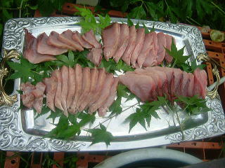 また、石橋君からの差入れの自家製の手打ちうどんは腰も強くて大変好評でした。 さらに、木村夫人からは郷里五島列島の郷土料理であるサバの押し寿司の差し入れがあり、初夏の味わいを楽しみました。