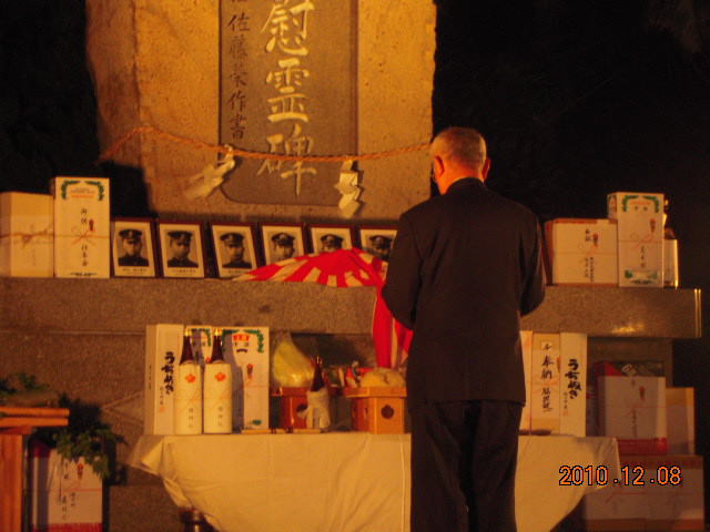この数年、12月8日は私にとって特別な日になりつつある。昭和16年12月8日は大東亜戦争開戦の日。開戦劈頭の真珠湾攻撃に参加した特殊潜航艇搭乗員たちの慰霊祭が毎年行われ、5年前から参加している。かつてその訓練基地だった三机という瀬戸内海の辺鄙な港町にある「大東亜戦争九軍神慰霊碑」の前で、特別攻撃隊員として戦死した青年と同じ年代の地元青年団の若者たちが、彼らの命日の夜、その仕事が終わってから慰霊追悼式を執り行う。